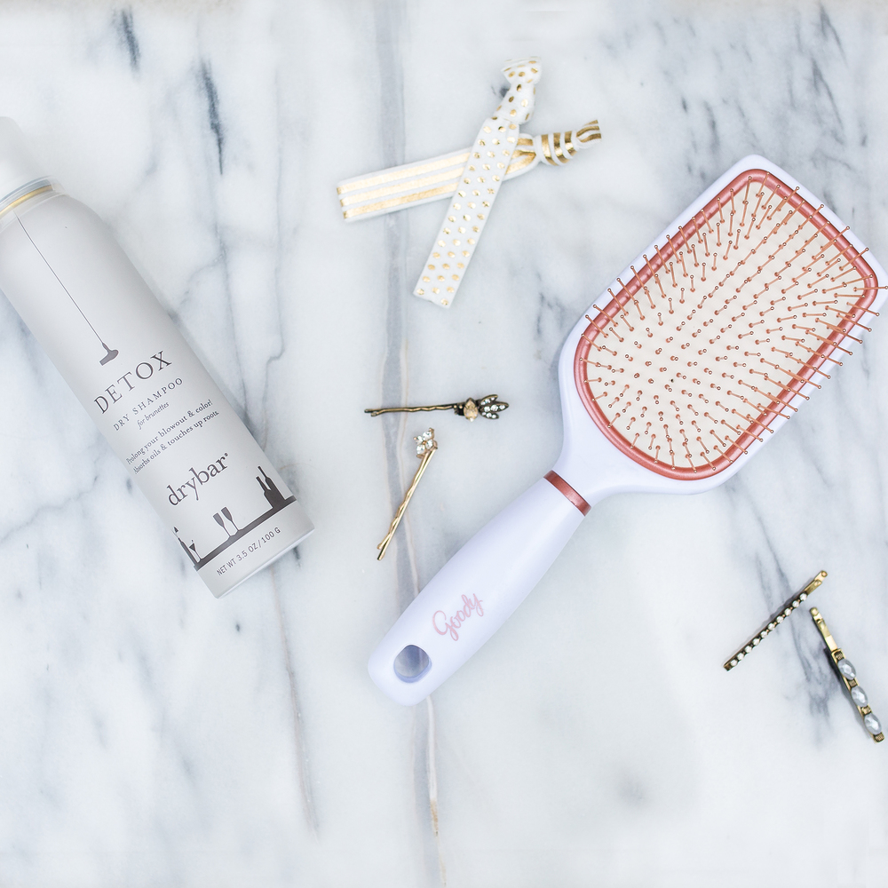 goody brush | drybar dry shampoo | anthropologie bobby pins | anthropologie hair elastics