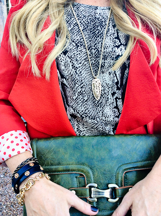 jen’s outfit details :: {gifted} kendra scott sienna pendant necklace in gold // nine west booties {no longer available, similar here} // brandi top from fab’rik {another great option here} // tapered ankle pants from white house black market {on sale $19.99} // clutch from fab’rik {no longer available, similar here} // tory burch double wrap leather bracelet // jcrew link bracelet  // langford market jacket {no longer available, similar here and here}//