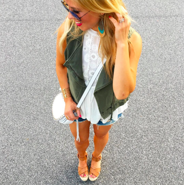 anthropologie vest | anthropologie tank | rag and bone shorts | similar shoes | rebecca minkoff bag | similar earrings | stella and dot cuff | ray ban sunglasses