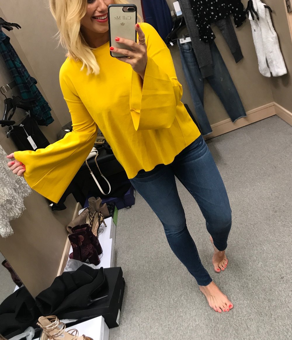 10. Topshop Flare-Sleeved Top. This golden yellow flare sleeved top is super stretchy and comfy. It has a unique criss-cross back that is ultra-chic. It’s a fun pop of color to integrate into your Fall wardrobe, and even start wearing in Summer paired with white denim!