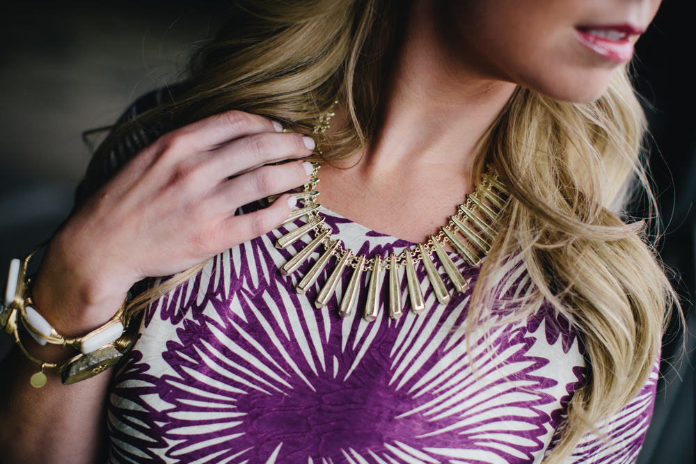 Hands down, this is my favorite “first” Spring dress purchase of the season. It’s the perfect dress to transition seasons in since it is three-quarter sleeves and also oh-so-peppy! I’ve paired with a few accessories that I am absolutely loving :: this quilted white leather tote that has a cute patterned interior and holds just about everything {including my lap-top!}, these yellow heels that are as comfy as they are cute and this a-mazing golden statement necklace.