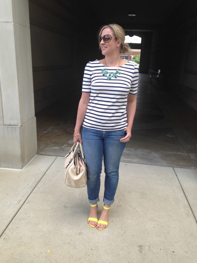 Top: Old Navy; Jeans: Gap (similar); Shoes: Old Navy; Necklace: Stella & Dot (on sale); Handbag: Kate Spade (on sale)